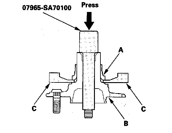6. Install the hub (A) and backing plate (B) on the new bearing unit (C) using the driver, the attachment, the support base and a hydraulic press. Be careful not to deform the backing plate.