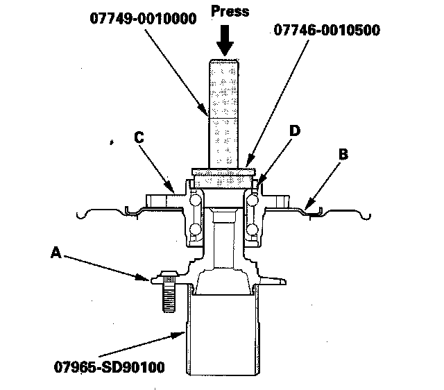 3. Separate the hub (A) and backing plate (B) from bearing unit (C) using the hub dis/assembly tool and a hydraulic press. Hold the bearing unit with a press attachment (D) or equivalent tool. Be careful not to deform the backing plate. Hold onto the hub to keep it from falling when pressed clear.