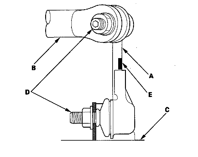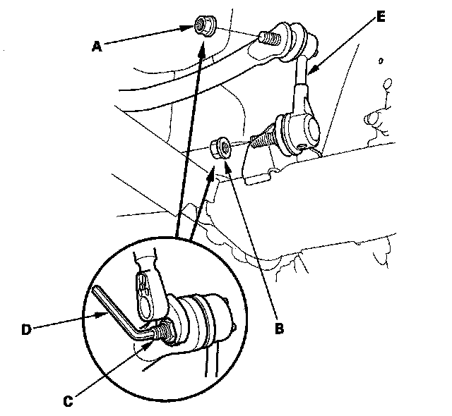 3. Remove the self-locking nut (A) and flange nut (B) while holding the respective joint pin (C) with a hex wrench (D), and remove the stabilizer link (E).