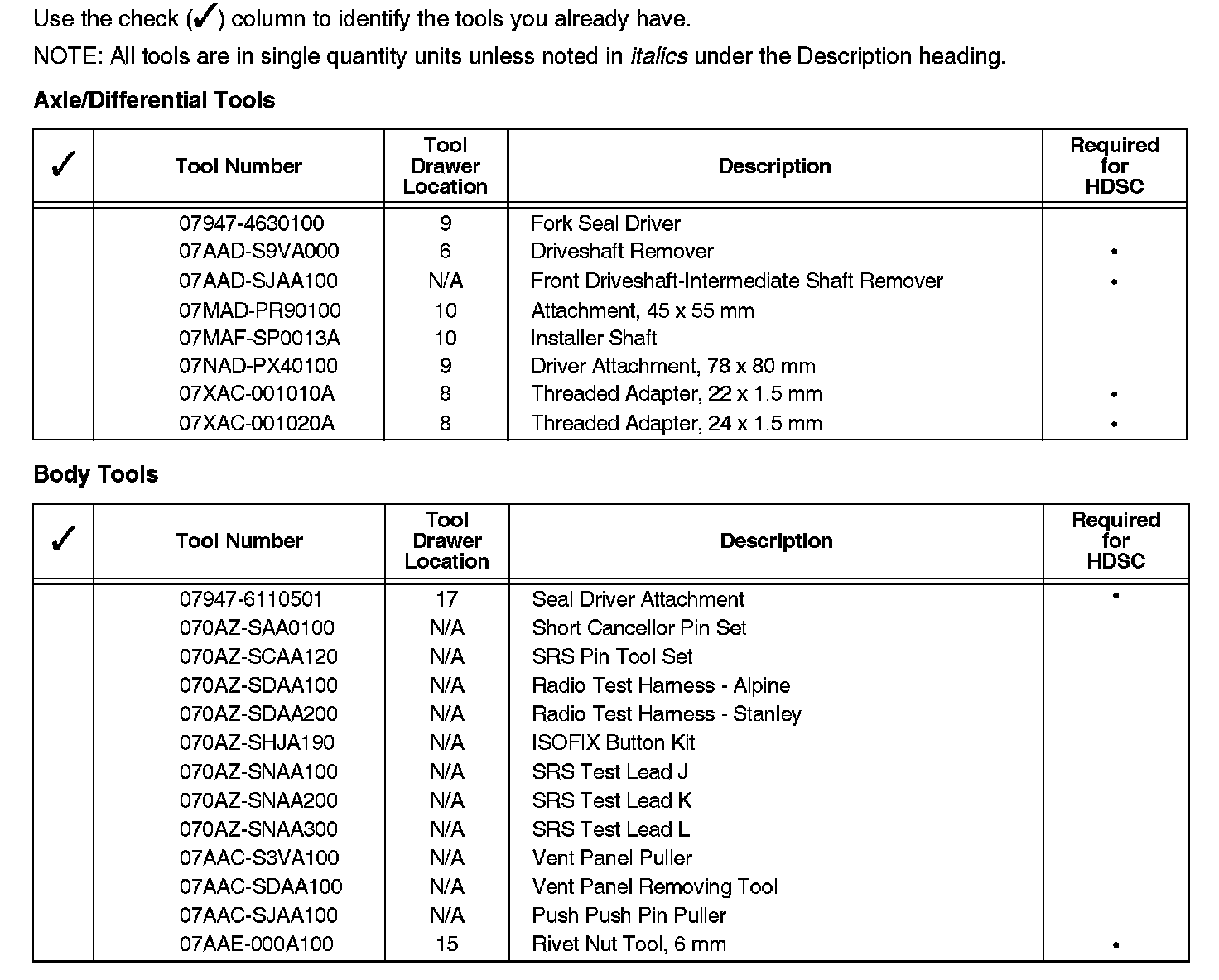 When a new model is introduced and requires special tools, those tools may be shipped to you automatically. If you receive a required special tool and believe you have an equivalent, refer to the Honda Service Operations Manual, Section 11, for the procedure to return items that have been distributed through the American Honda Tool and Equipment Program.