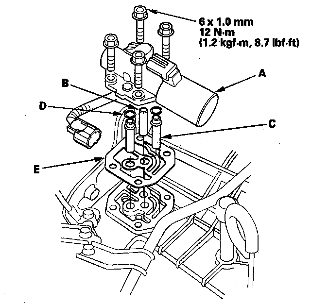 4. Remove the ATF pipe (B), ATF joint pipes (C), O-rings (D), and gasket (E).