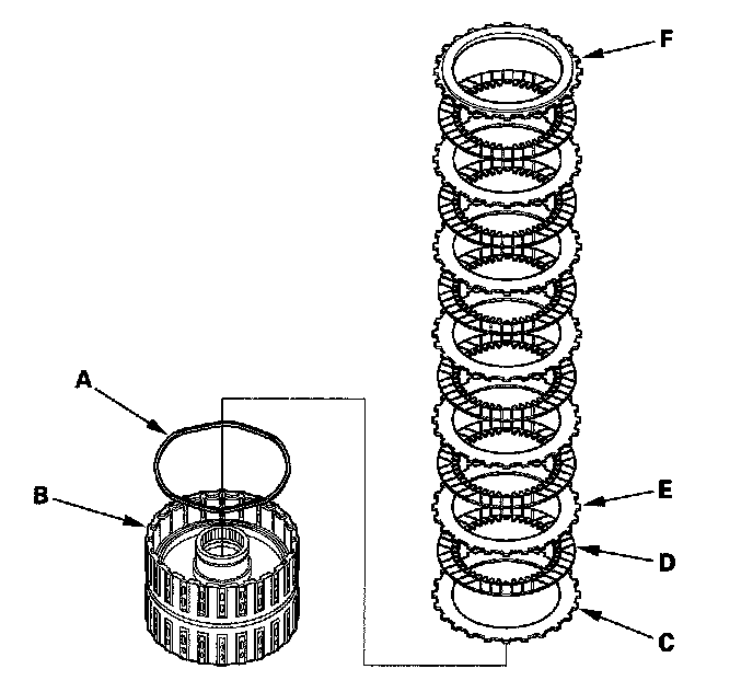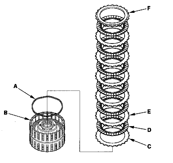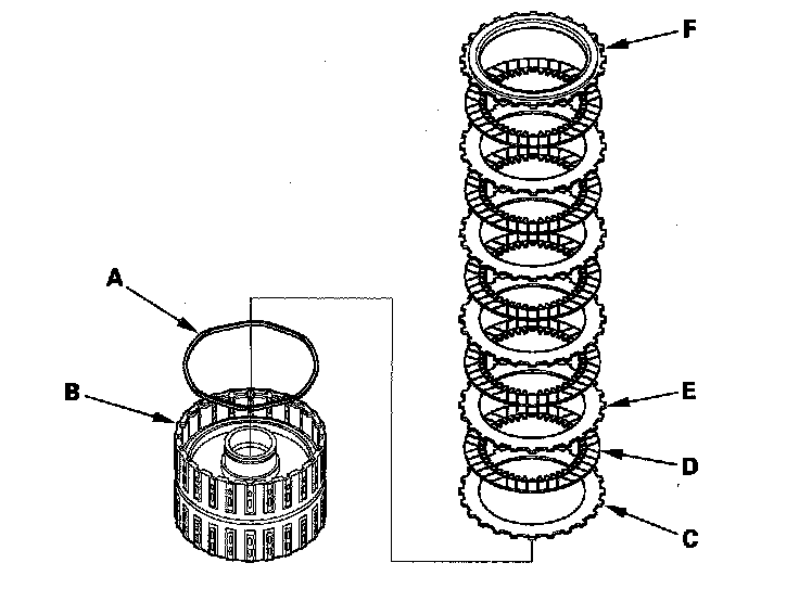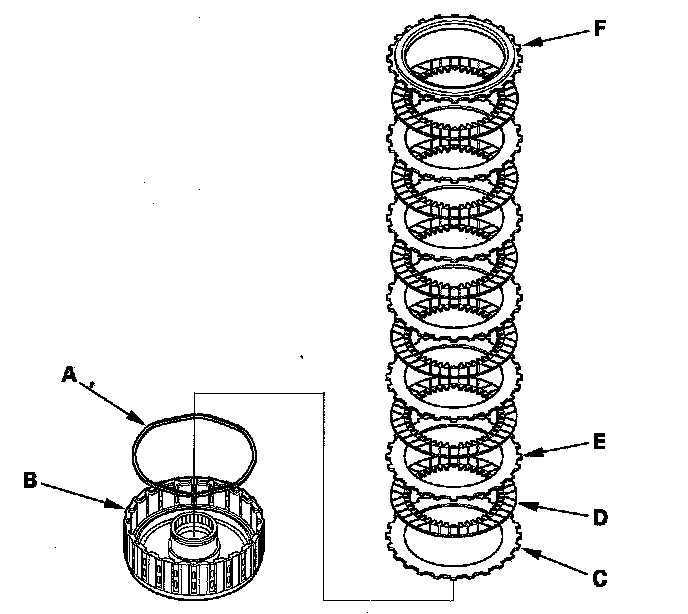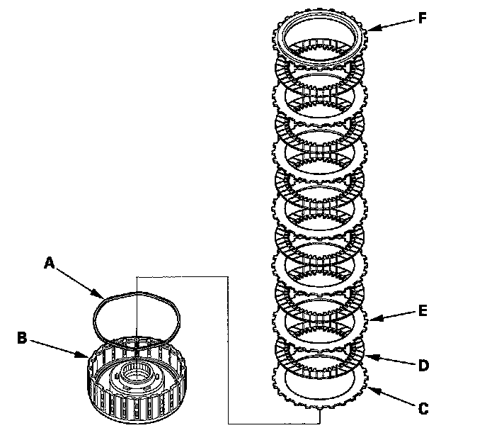 14. Install the waved spring (A) in the 2nd clutch drum (B). Install the flat-plate (C), then starting with the clutch disc, alternately install the clutch discs (D) (6) and waved-plates (E) (5), then install the clutch end-plate (F) with the flat side toward the disc.