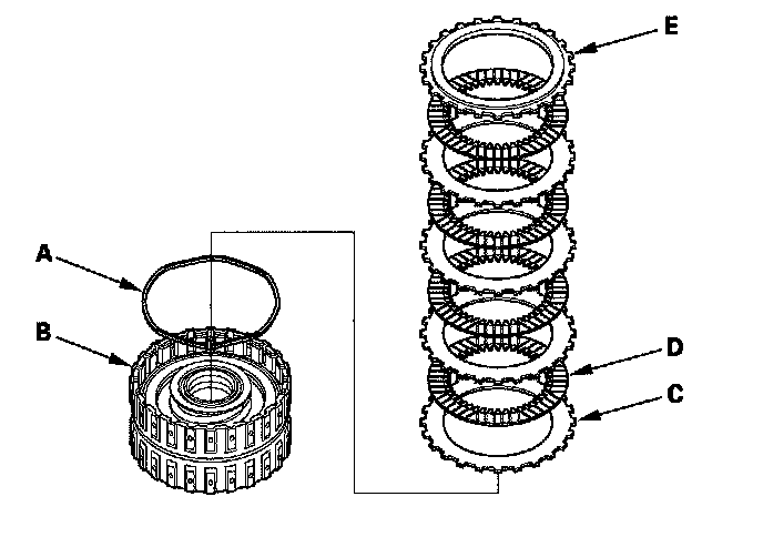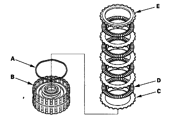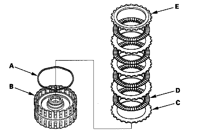 6. Install the waved spring (A) in the 4th clutch drum (B). Starting with the clutch waved-plate, alternately install the clutch waved-plates (C) (4) and clutch discs (D) (4), then install the clutch end-plate (E) with the flat side toward the disc.