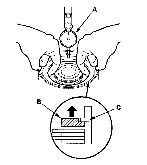 10. Zero the dial indicator with the clutch end-plate lifted up to the snap ring (C).