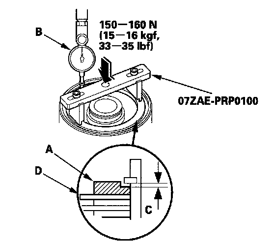 12. Press the special tool down with 150-160 N (15-16 kgf, 33-35 lbf) using a force gauge, and read the dial indicator (B). The dial indicator reads the clearance (C) between the clutch end-plate and top disc (D). Take measurements in at least three places, and use the average as the actual clearance.