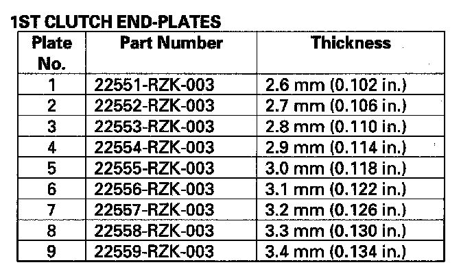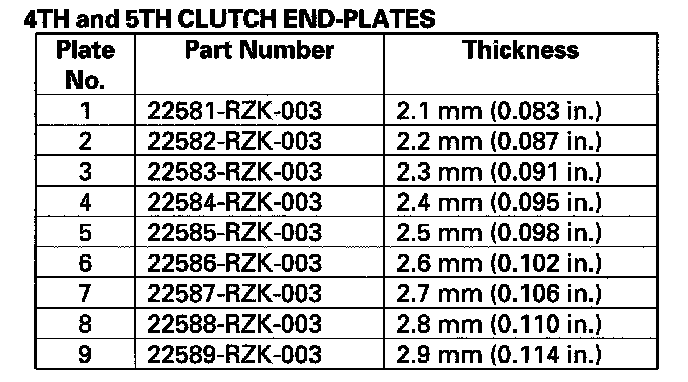 13. If the clearance is out of the service limit, select a new clutch end-plate from the following table.
