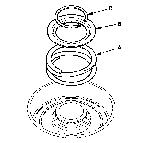 5. Install the return spring (A) and spring retainer (B), and position the snap ring (C) on the retainer.