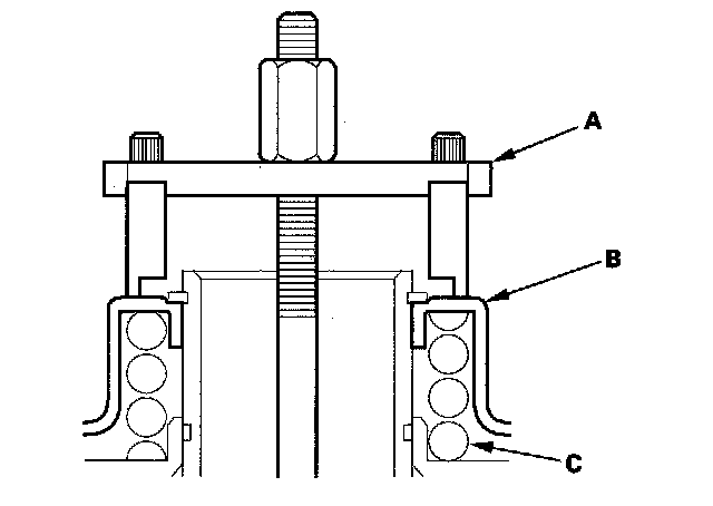 8. Set the special tool (A) on the spring retainer (B) of the 1st, 2nd, and 3rd clutches in such a way that the special tool compresses the clutch return spring (C).