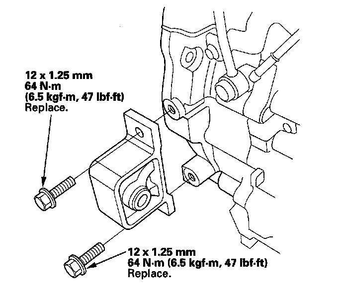 54. Tighten the transmission mount bolt to 54 Nm (5.5 kgf-m, 40 lbf-ft), tighten the rear mount bolt to 64 Nm (6.5 kgf-m, 47 lbf-ft), and lastly tighten the front mount bolt to 64 Nm (6.5 kgf-m, 47 lbf-ft).