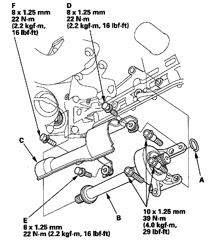 26. Install the shift cable holder (E) and the shift cable bracket (F), then install the shift cable cover (G).