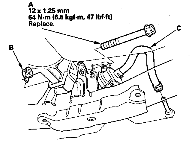 23. Install the front mount bolt (A) and nut (B), connect the ATF cooler hose (C) to the ATF cooler line, then secure the hose with the clip.