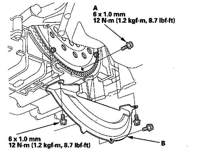 28. Install the torque converter cover (B).