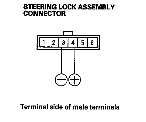 4. Connect the battery positive terminal to steering lock assembly connector terminal No. 4, and connect the battery negative terminal to No. 3 terminal. Make sure that the ignition key cannot be turned to LOCK (0) position. Release the battery terminals, and make sure that the key can be turned to LOCK (0) position and removed from the cylinder.