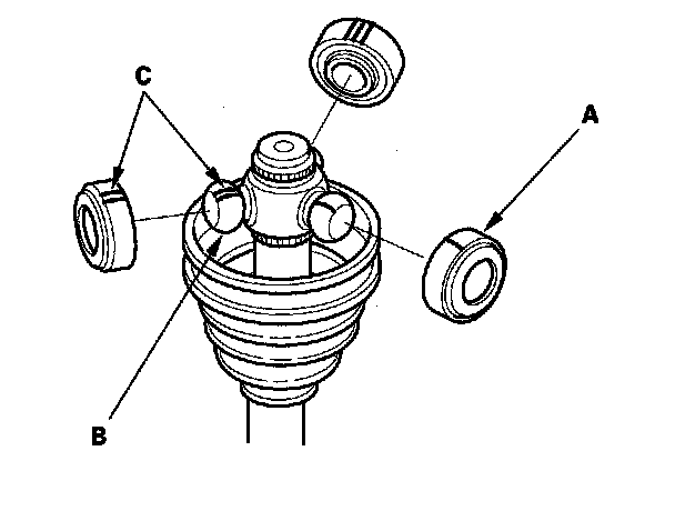 9. Fit the boot (A) ends onto the driveshaft (B) and the outboard joint (C).