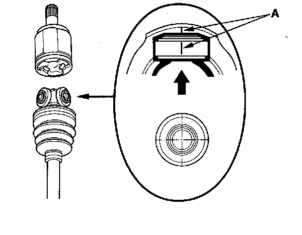 ^ Reinstall the inboard joint onto the driveshaft by aligning the marks (A) you made on the inboard joint and the rollers.