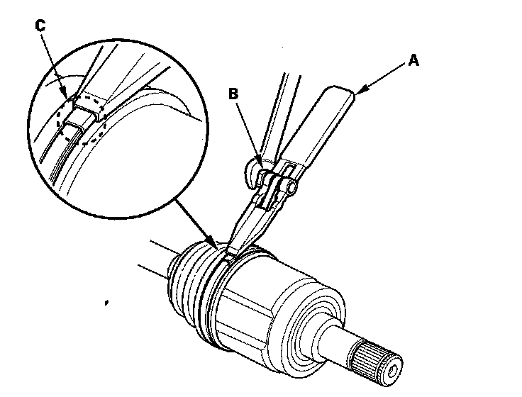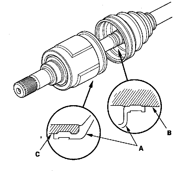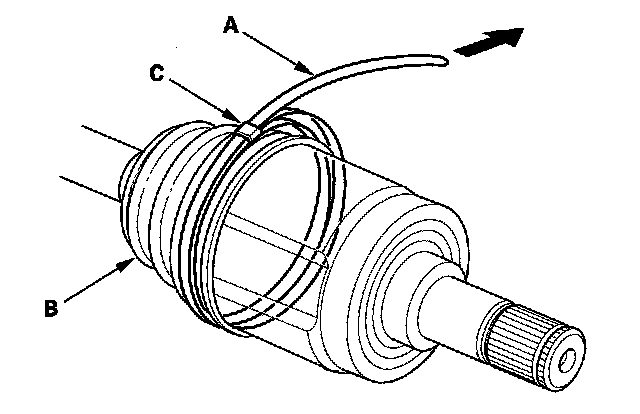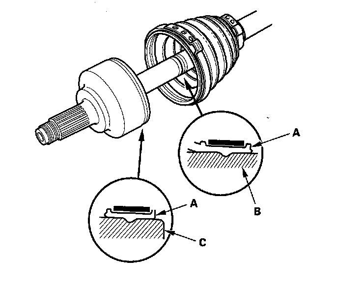 8. Fit the boot (A) ends onto driveshaft (B) and the inboard joint (C).