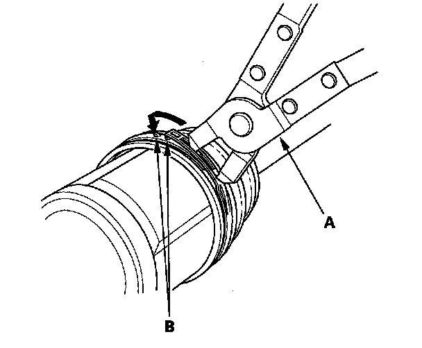 10. Close the ear portion (A) of the band with commercially available boot band pliers Kent-Moore J-35910 or equivalent (B).