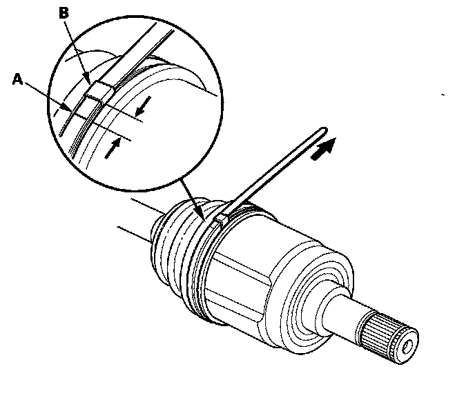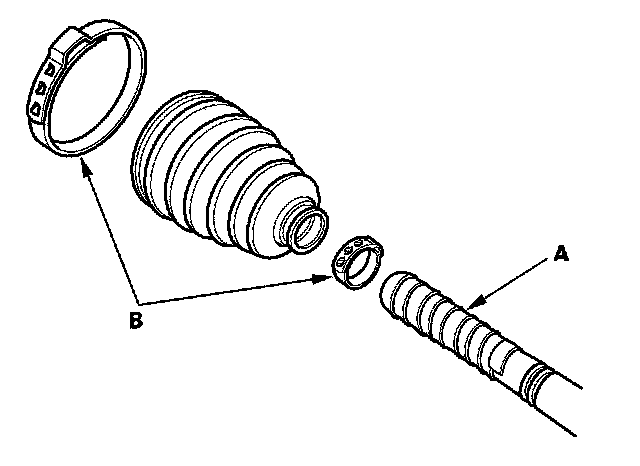 14. Fit the boot ends onto the driveshaft and the inboard joint, then install the new double loop band (A) onto the boot (B).