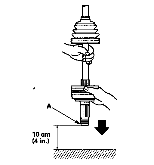 6. To completely seat the outboard joint, pick up the driveshaft and joint, and tap or hit them from a height of about 10 cm (4 in.) onto a hard surface.