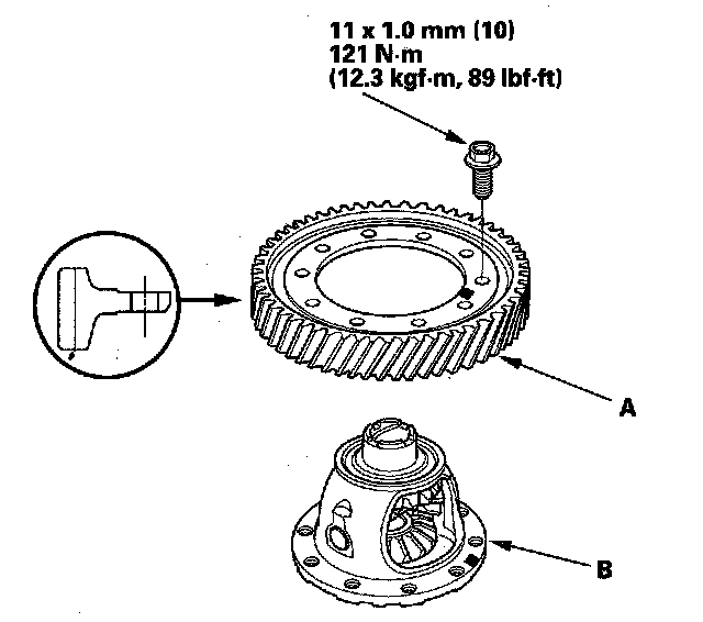 1. Remove the bolts (left-hand threads) in a crisscross pattern in several steps, then remove the final driven gear (A) from the differential carrier (B).