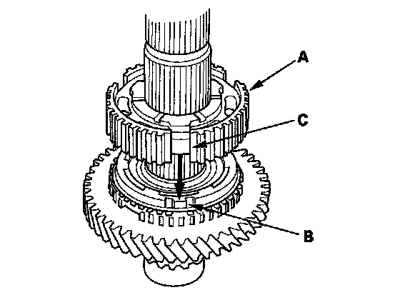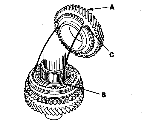 10. Install 2nd gear (A) by aligning the synchro cone fingers (B) with the grooves in 2nd gear (C).