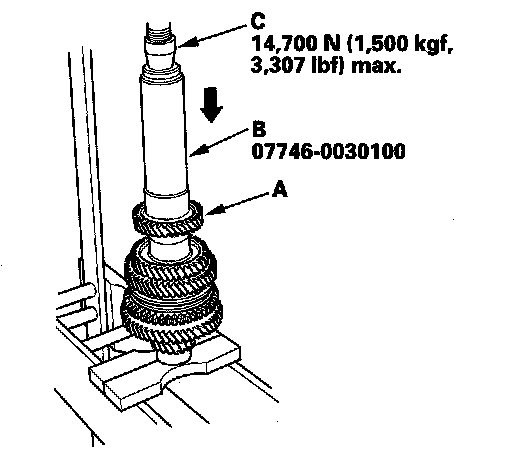 13. Install 5th gear (A) using the 40 mm I.D. driver (B) and a press (C).