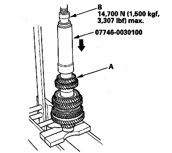 12. Install 4th gear (A) using the 40 mm I.D. driver (B) and a press (C).