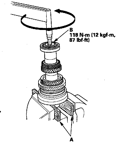 20. Securely clamp the countershaft assembly in a bench vise with wood blocks (A).