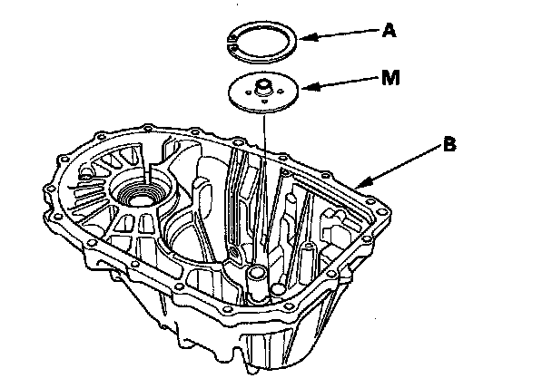 1. Remove the 72 mm shim (A) and oil guide plate M from the transmission housing (B).