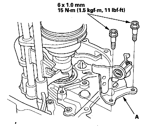 14. Install transmission hangers A, B, and the 8 mm flange bolts, finger-tight.