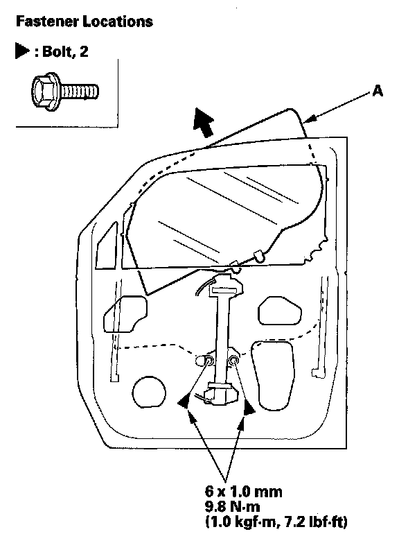 2. Carefully lower the glass (A) until you can see the bolts, then remove them. Carefully pull the glass out through the window slot. Take care not to drop the glass inside the door.