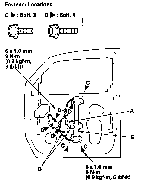 4. Remove the bolts (C), and loosen the bolts (D), then remove the regulator (E) through the hole in the door.