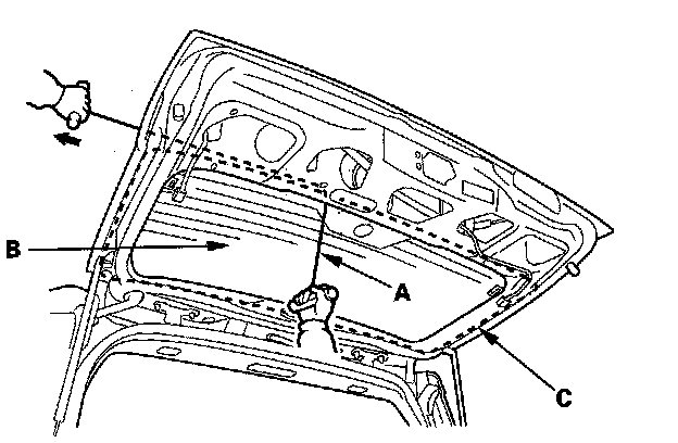 5. With a helper on the outside, pull the piano wire (A) back and forth in a sawing motion. Hold the piano wire as close to the rear window (B) as possible to prevent damage to the tailgate, and carefully cut through the adhesive (C) around the entire rear window.