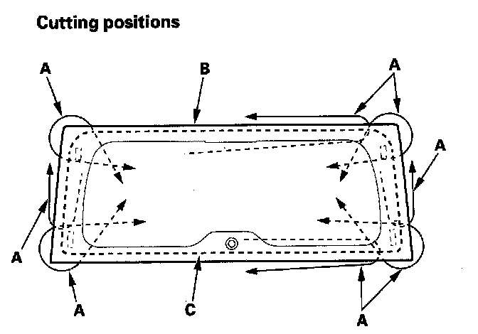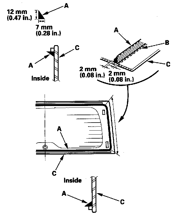 17. Put the cartridge in a caulking gun, and run a bead of adhesive (A) on the glass primer trace (B) you applied on step 14, and around the edge of the rear window (C) as shown.
