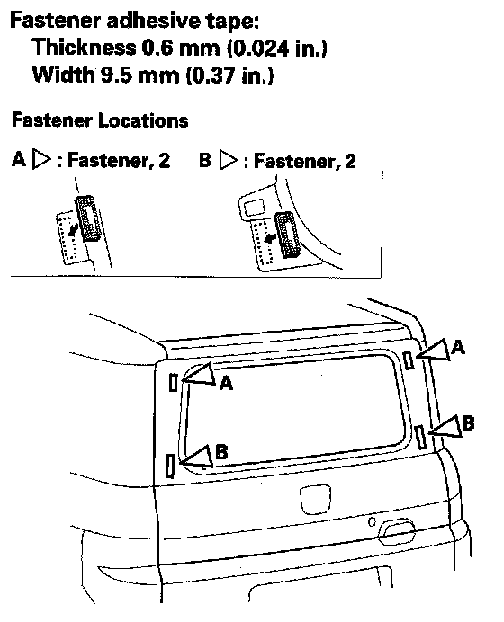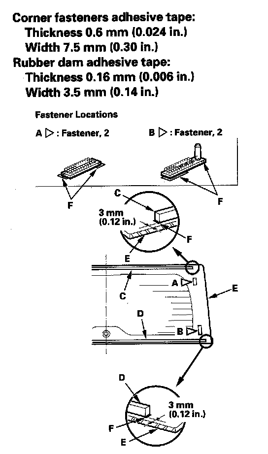 10. Attach the upper corner fasteners (A) and lower corner fasteners (B) with adhesive tape. Attach the upper rubber dam (C) and lower rubber dam (D) with adhesive tape to the inside surface of the rear window (E) as shown: