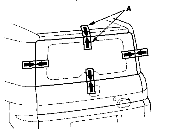 12. Set the rear window in the opening, and center it. Make alignment marks (A) across the rear window, tailgate, and body with a grease pencil at the four points shown. Be careful not to touch the rear window where adhesive will be applied.