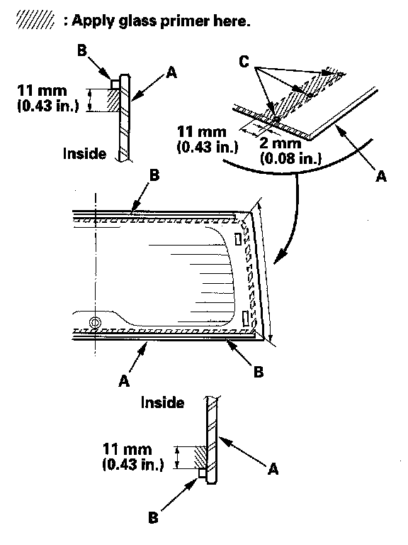- Do not apply body primer to the rear window, and do not get body and glass primer sponges mixed up.