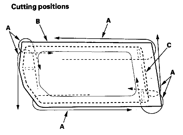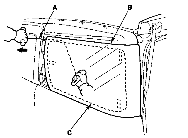 5. With a helper on the outside, pull the piano wire (A) back and forth in a sawing motion. Hold the piano wire as close to the quarter glass (B) as possible to prevent damage to the body, and carefully cut through the adhesive (C) around the entire quarter glass.