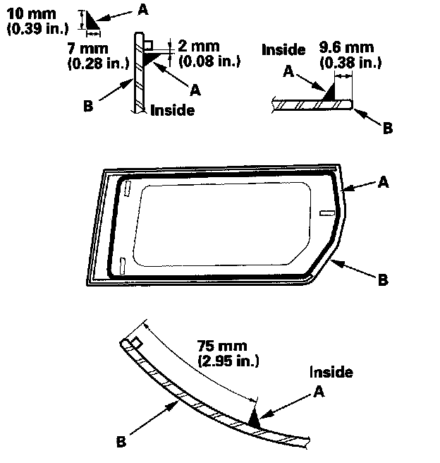 15. Put the cartridge in a caulking gun, and run a bead of adhesive (A) around the edge of the glass (B) as shown. Apply the adhesive within 30 minutes after applying the glass primer. Make a slightly thicker bead at each corner.