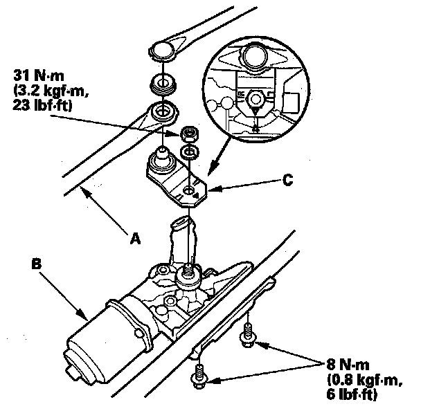 4. Remove the mounting bolts and the wiper linkage assembly (C).
