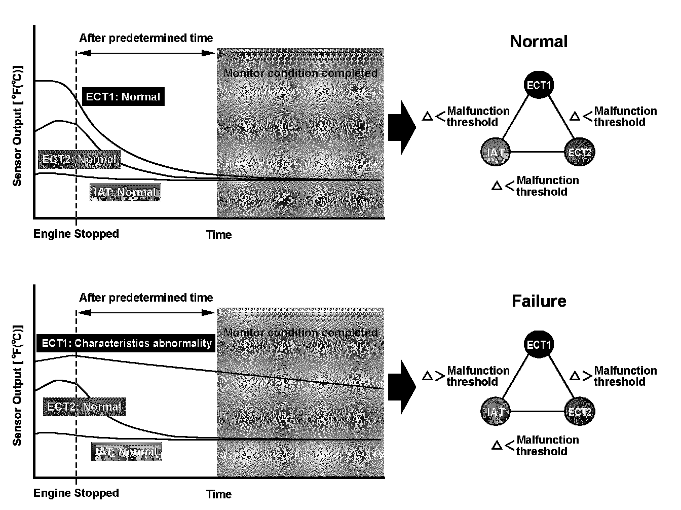 When the engine is stopped and enough time has passed, the temperature of the engine will equal the ambient temperature. When an inappropriate temperature is detected after comparing the temperature readings of each sensor, a malfunction in the corresponding sensor is detected and a DTC is stored.