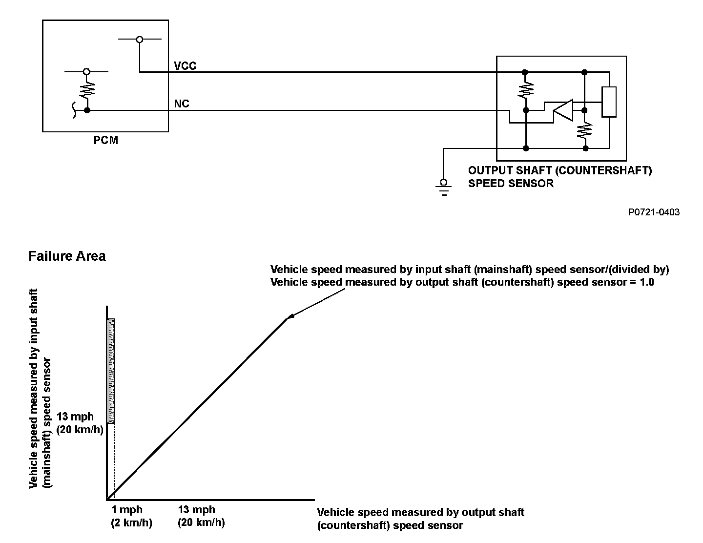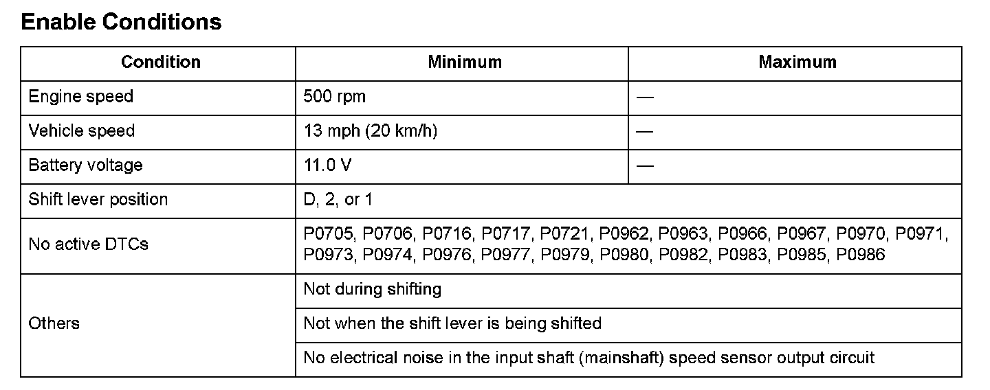 When the vehicle speed measured by the input shaft (mainshaft) speed sensor is 13 mph (20 km/h) or more, the vehicle speed measured by the output shaft (countershaft) speed sensor is 1 mph (2 km/h) or less for at least 10 seconds.