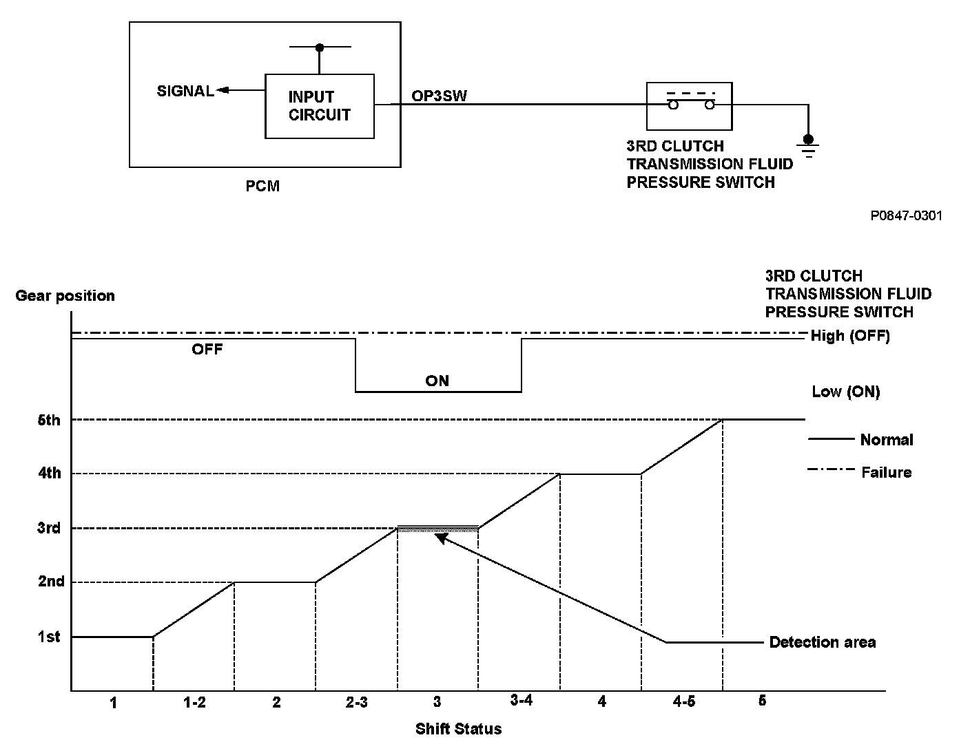 The input signal from the 3rd clutch transmission fluid pressure switch to the PCM is high when driving in 3rd gear.