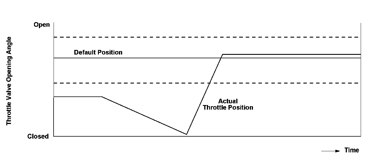If the throttle valve does not return to the default position when the throttle actuator control module moves the throttle actuator to the default position from the fully closed position, a malfunction is detected and the malfunction data is transmitted to the ECM/PCM. When the ECM/PCM receives the malfunction data from the throttle actuator control module, the ECM/PCM detects a malfunction in the throttle valve default position spring, and a DTC is stored.