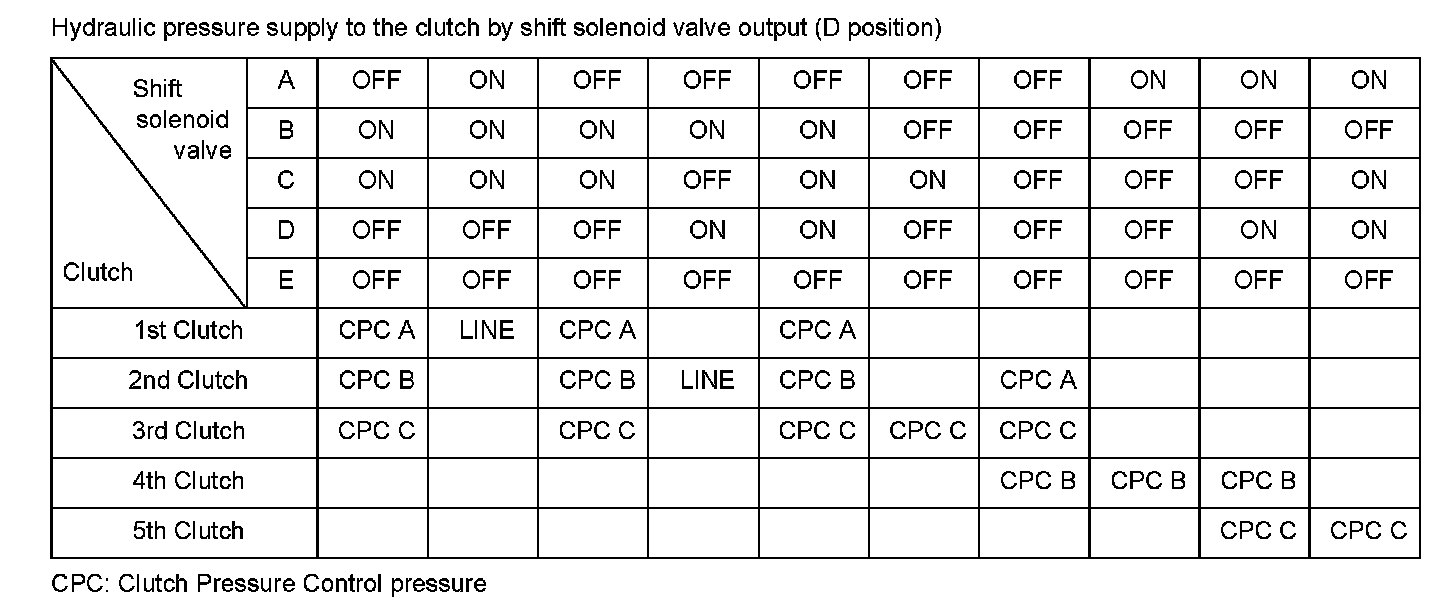 Hydraulic pressure to each clutch is controlled by the shift valve. The shift valve activates according to the ON/OFF status of shift solenoid valves A, B, C, D, and E. Hydraulic pressure supply in D position is shown above. The line pressure or the clutch pressure control pressure (CPC A, CPC B, or CPC C) is supplied to each clutch by the shift valve activated. The powertrain control module (PCM) computes the actual ratio of mainshaft to countershaft revolutions. If a difference between the actual ratio and the commanded gear occurs when shifting to each gear position, a malfunction in the shift solenoid valve or the hydraulic system is detected and a DTC is stored.