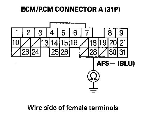 9. Check for continuity between ECM/PCM connector terminal A28 and body ground.