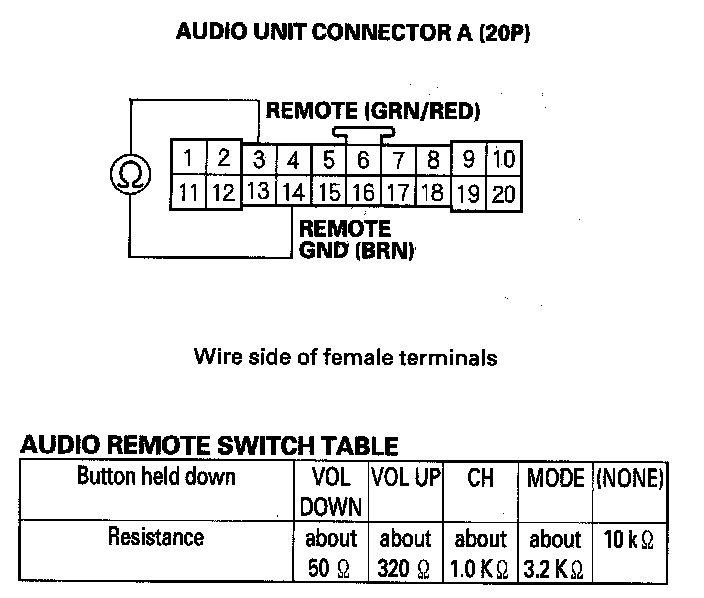 4. Measure the resistance between audio unit connector A (20P) No. 3 and No. 14 terminals as specified in the table.
