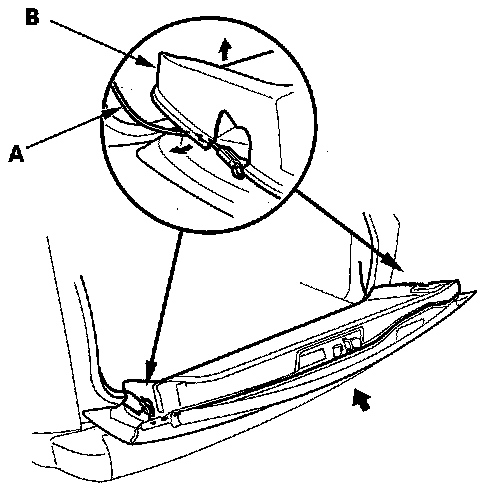 4. Close the tailgate half-way and hold it there to loosen the tailgate support cables (A) on both sides. Pull up on the bottom edge of the trim panel (B)and pass the cables under the trim panel on each side.