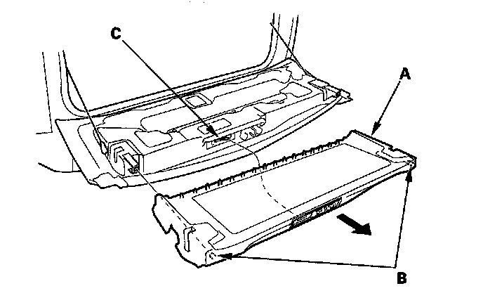 5. Pull the trim panel (A) out to release the pins (B) of the trim panel and the tailgate handle lever (C), then remove the trim panel.