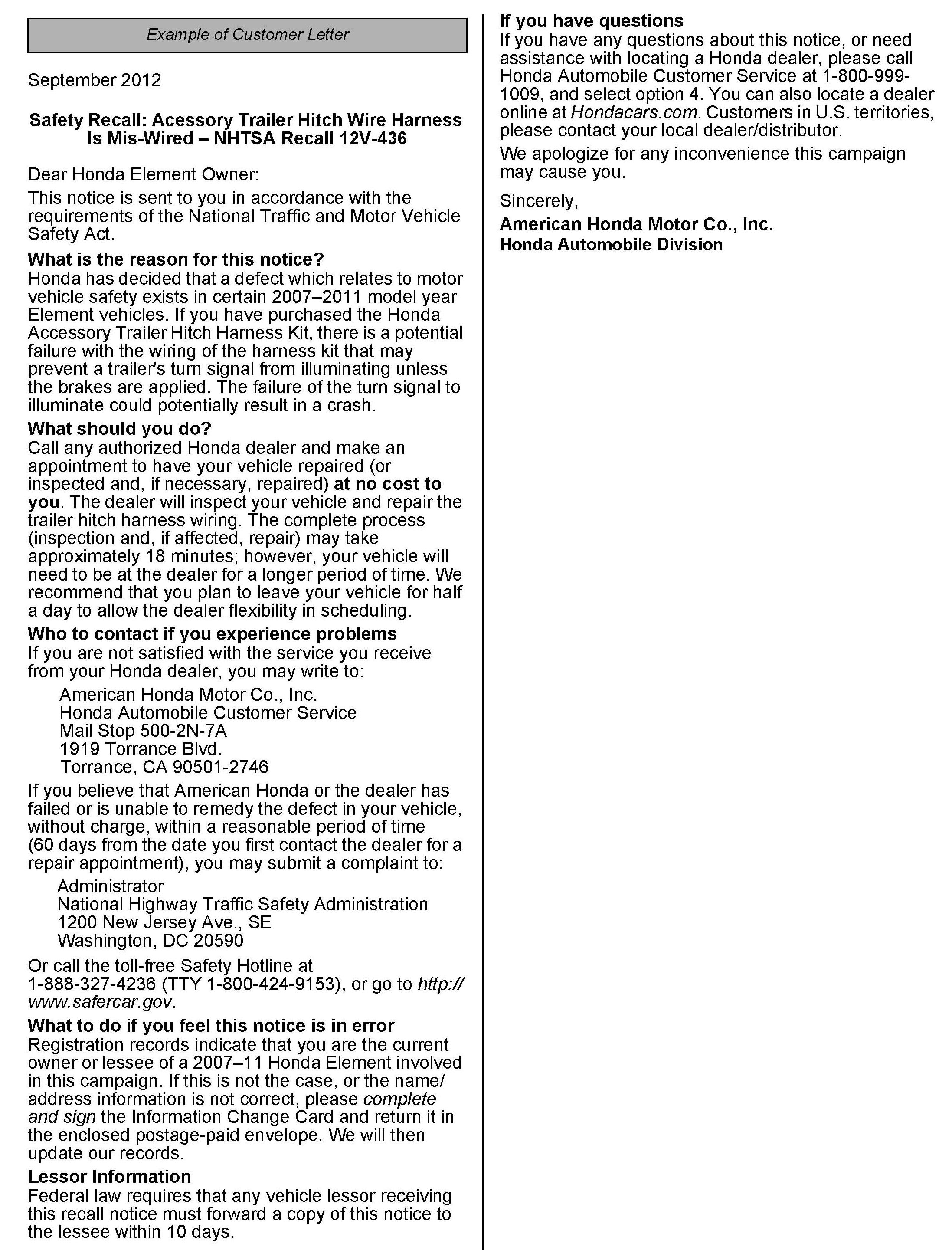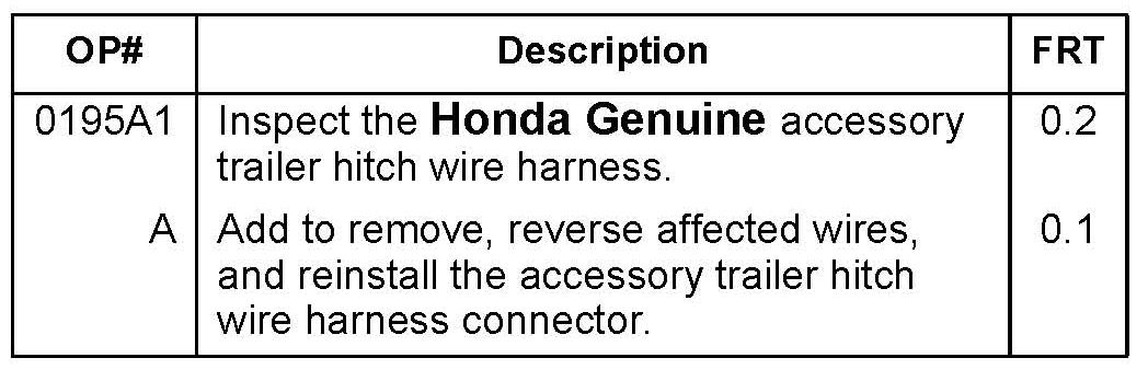 If the vehicle is not equipped with a Honda Genuine accessory trailer hitch wire harness, either you or your customer must fill out and return a Campaign Status Change Request form to remove the vehicle from this recall. We supplied your dealership with a small quantity of these response forms; additional forms can *be ordered through Helm using reorder # Y0893.*